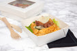 Descubre la caja cuadrada de cartón blanco con tapa ventana KRAY de 205x205mm y 40mm de altura, ideal para tus servicios de comida para llevar. Con...